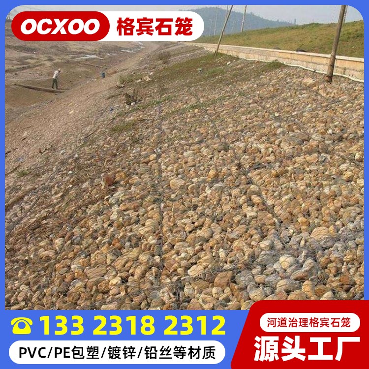 防洪护堤格宾石笼材质:格宾石笼根据不同客户对格宾石笼及使用年限的不同要求,原材质可以分为:电镀锌丝、普通热度锌丝、高热镀锌丝、PVC包塑丝、PE包塑丝、镀高尔凡、5%锌铝合金、10%锌铝合金等。